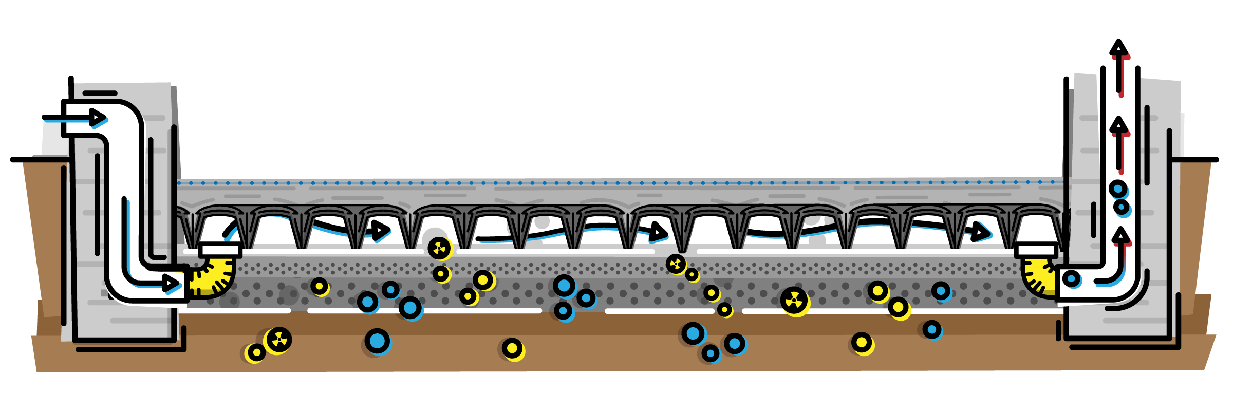 Protilehlá dvojice přívodního a odvodního kanálku by se měla v ideálním případě vybudovat vždy na tři až pět metrů délky místnosti a musí být adekvátně umístěna tak, aby bylo umožněno proudění ve všech částech dutiny. Alternativou, např. při nedostatku prostoru pro umístění více přívodních trubek, je svedení jediné přívodní trubky veprostřed a její rozdvojení pomocí drenážní trubky („husího krku“) a vedení podél stěny až k rohům dutiny, kde opět napojíme KG koncovky. Tímto se zajistí plnohodnotné proudění v celém objemu dutiny.