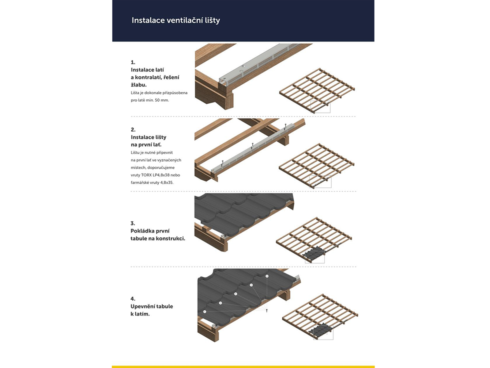 Speciální konstrukce ocelové ventilační lišty chrání střechu před ptáky a hlodavci. Lišta je dokonale přizpůsobena pro latě o šířce 50 mm i 60 mm a má speciálně připravené montážní otvory pro snadnou a rychlou instalaci.